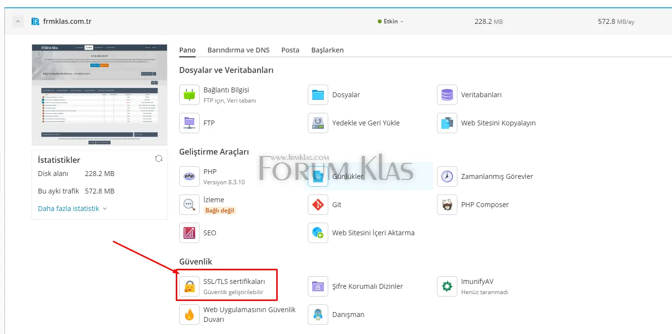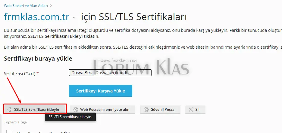 CSR kodu oluşturulacak siteyi seçin ve SSL/TLS sertifikaları seçeneğine tıklayın.