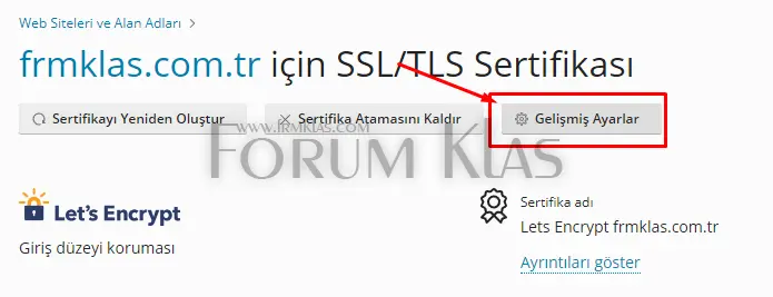 Açılan pencerede üstte bulunan gelişmiş ayarlar butonuna tıklayın ardından SSL/TLS sertifikası ekle butonuna tıklayın.
