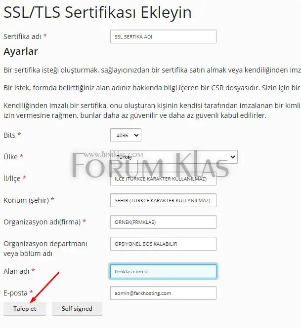 Açılan formu aşağıdaki şekilde görüldüğü gibi doldurarak talep et butonuna tıklayın. Form içerisinde ki alanlarda Türkçe karakter kullanmayınız.